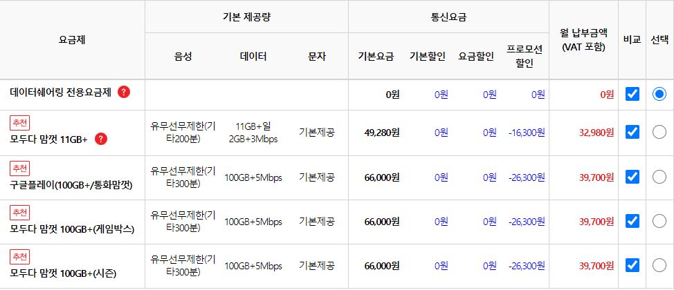 모두다 맘껀 11GB와 100GB 맘껏 시리즈중에 고민했는데